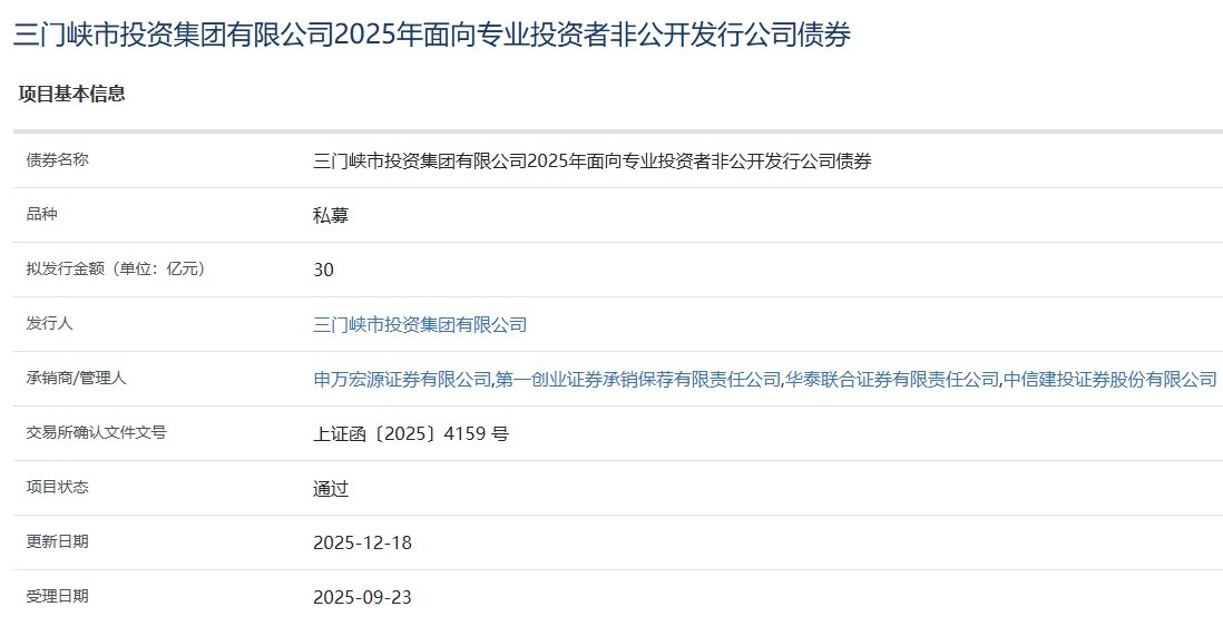 【大河财立方音问】12月18日,三门峡市投资集团有限公司2025年面向专科投资者非公诞生行公司债券获上交所通过。该债券拟刊行金额30亿元,承销商/处分东谈主为申万宏源证券、第一创业证券承销保荐公司、华泰纠合证券和中信建投。2025年6月26日,经中诚信外洋空洞评定,刊行东谈主主体信用评级为AA+,权衡闲暇。