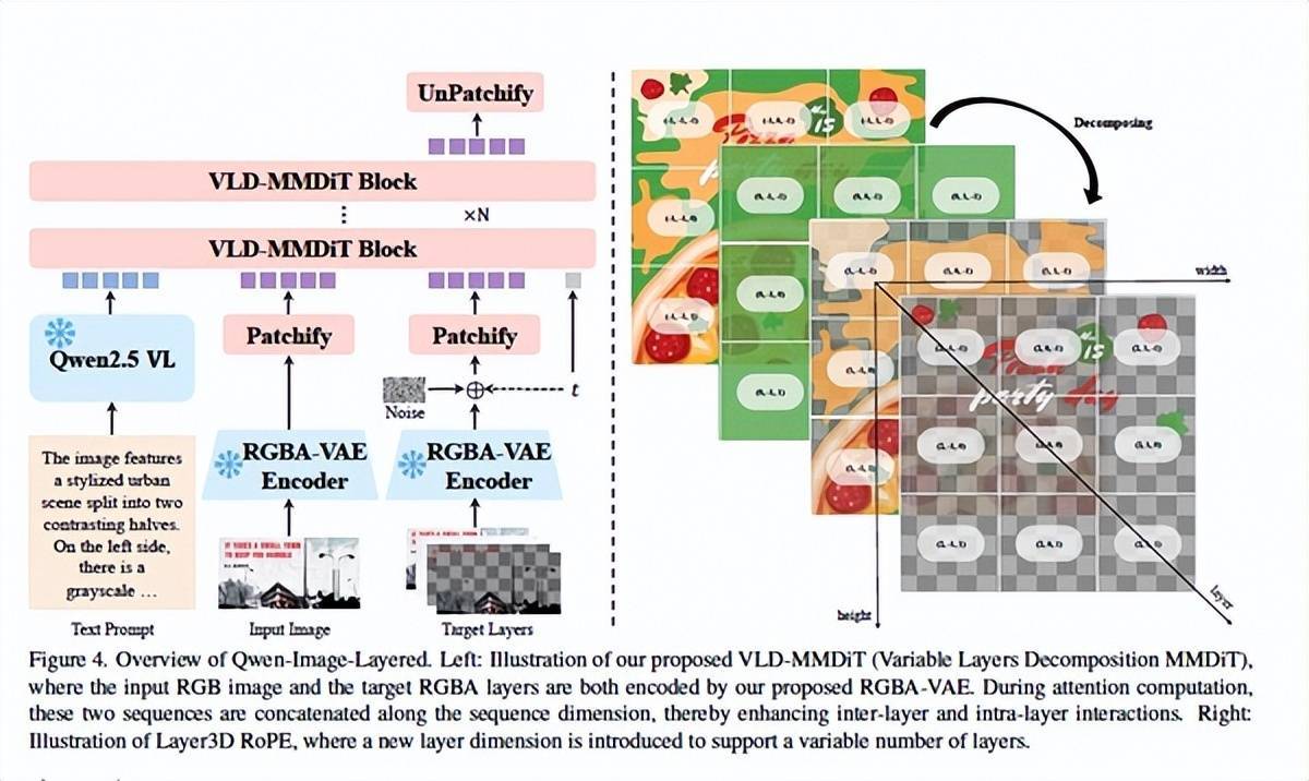 Qwen-Image-Layered 的出现,意味着视觉大模子从“像素瞻望”转向“结构重组”。千问团队自研了一种全新的RGBA-VAE编码,在传统的RGB图像中引入代表透明度图层的“Alpha通谈”,让模子有了图层的办法。