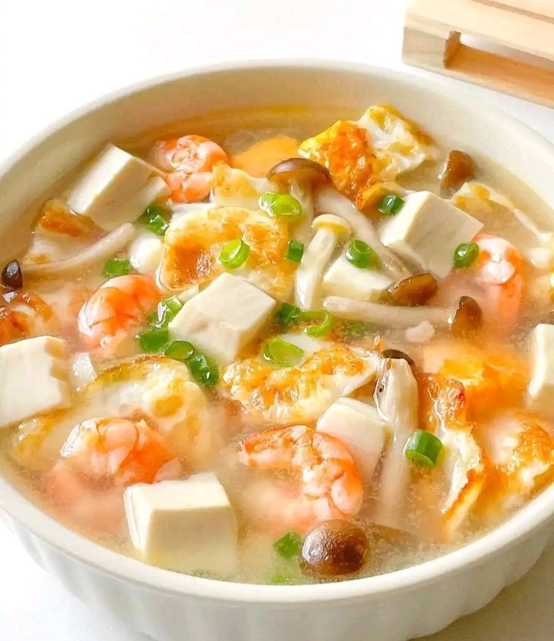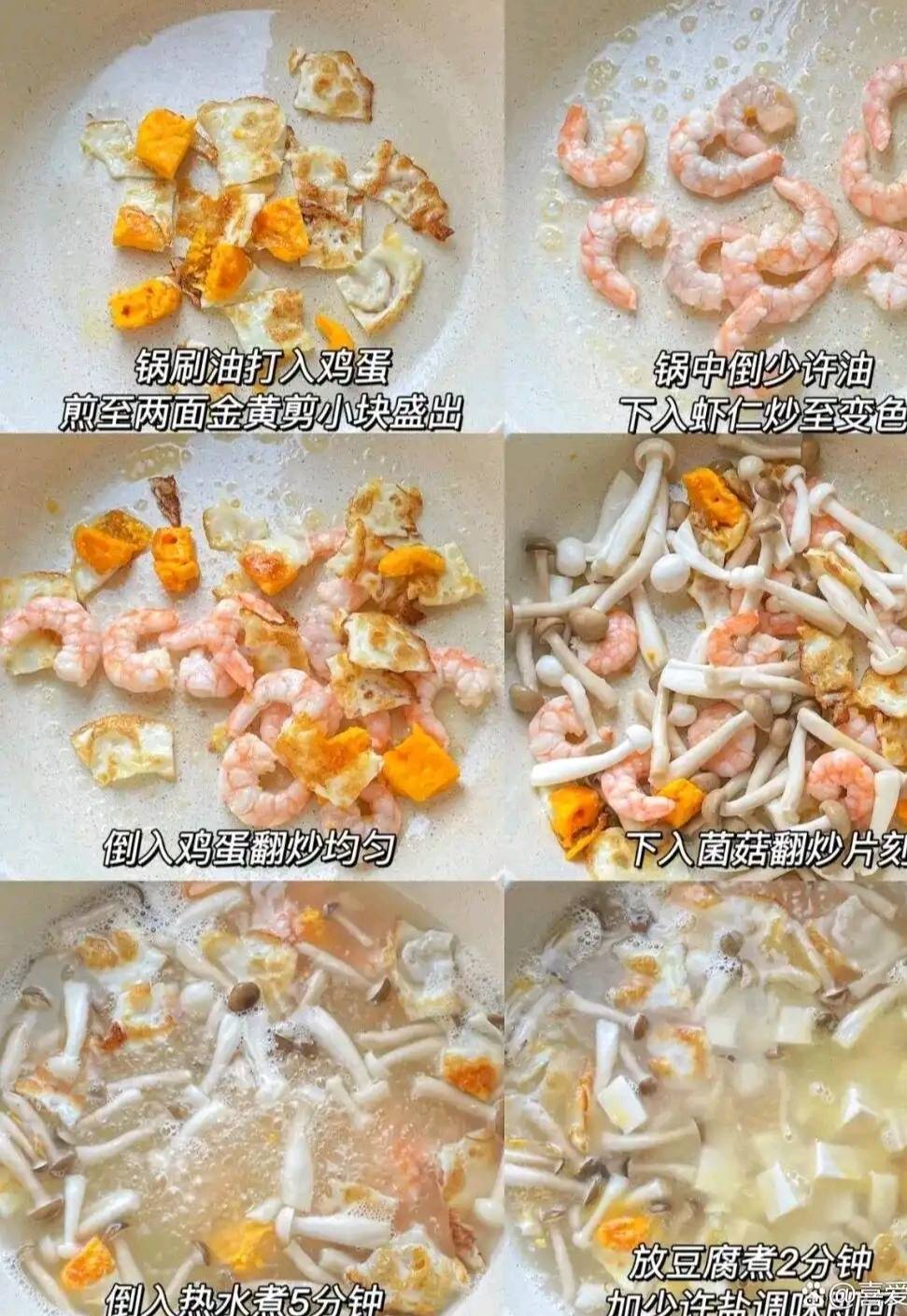 【食材】:鸡蛋2个、虾仁100克、嫩豆腐1块、菌菇50克、盐小数、食用油适量。