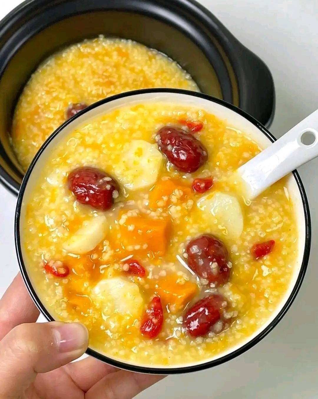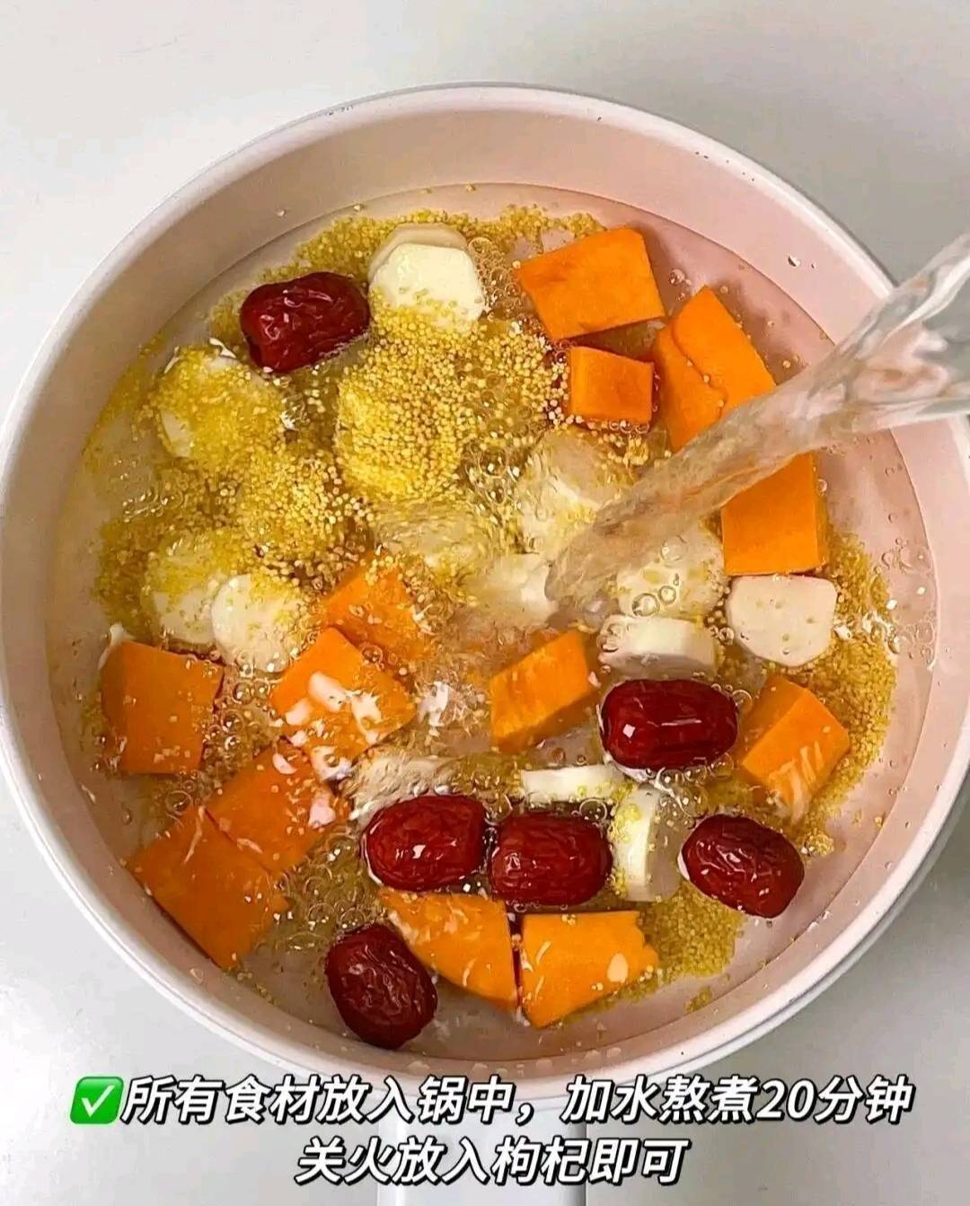 【食材】:小米50克、南瓜块、山药块、红枣、枸杞。