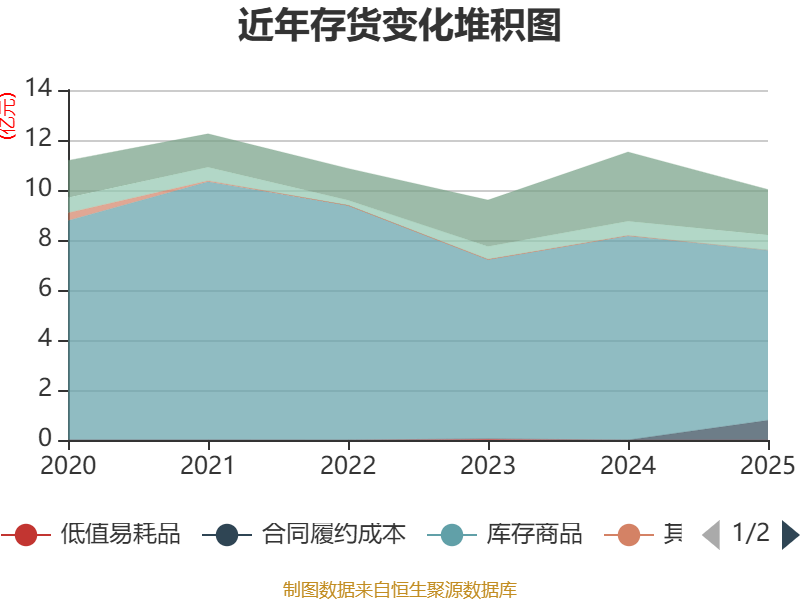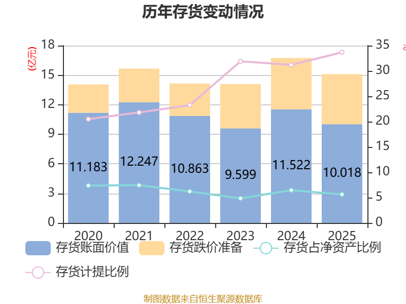 从存货变动来看,截止2025年末,公司存货账面价值为10.02亿元,占净财富的5.63%,较上年末减少1.5亿元。其中,存货跌价准备为5.09亿元,计提比例为33.68%。