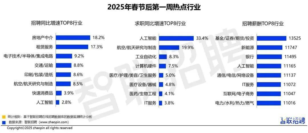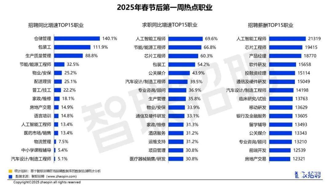 从广州“新春第一招”东说念主工智能专区的火热不丢脸出,连年来跟着数字化转型和智能化升级程度加快鼓舞,百行万企对期间类东说念主才的需求持续攀升。加之春节期间DeepSeek在全球范围内的火爆出圈,更是进一步助推了AI激越,使关联岗亭成为当下招聘市集的“香饽饽”,呈现供需两旺态势。