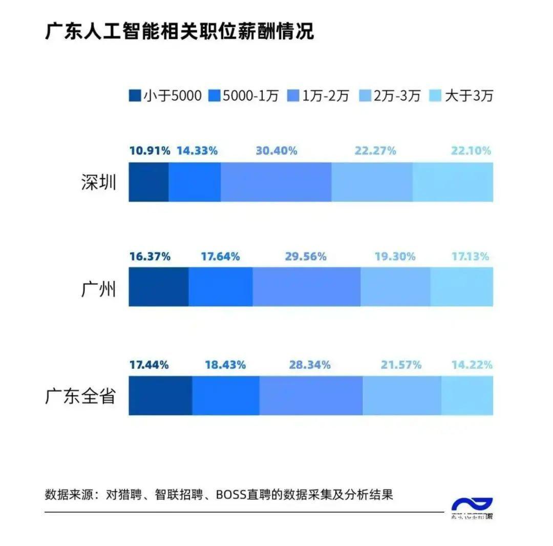 在供给端,智联招聘发布的《2025年春招市集行情周报》炫耀:2025年春招首周,东说念主工智能行业求职东说念主数同比增速33.4%,居行业第一,东说念主工智能工程师相同以69.6%的求职增速位居行状榜首,并以21319元的平均招聘月薪领跑行状第一,进一步印证了国内AI大模子期间的赶快崛起对办事市集的影响。地域漫步上,广东行动东说念主工智能发展大省,成为求职者们宠爱的“求职胜地”,节后第二周世界东说念主工智能行业求职东说念主数中,深圳占11.7%、广州占5.7%,分列第二、第五位。
