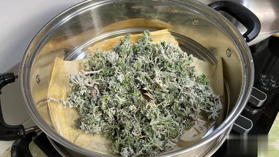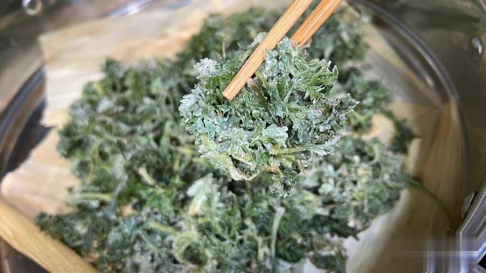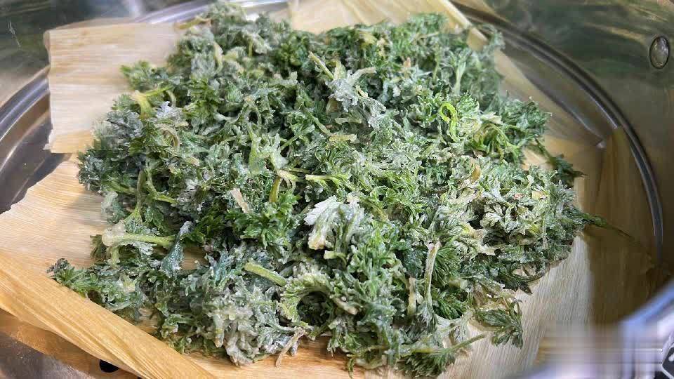 第四步:蒸锅中垫上玉米叶子大致屉布,把白蒿均匀摊开,大火烧开后蒸5分钟就熟了,闻到幽香滋味基本就不错关火了,别蒸太久,要掌合手好火候。