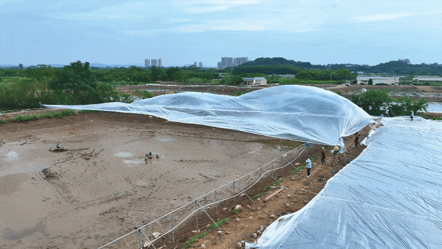 ▲ 虾塘冬棚盖膜。邓达荣 摄